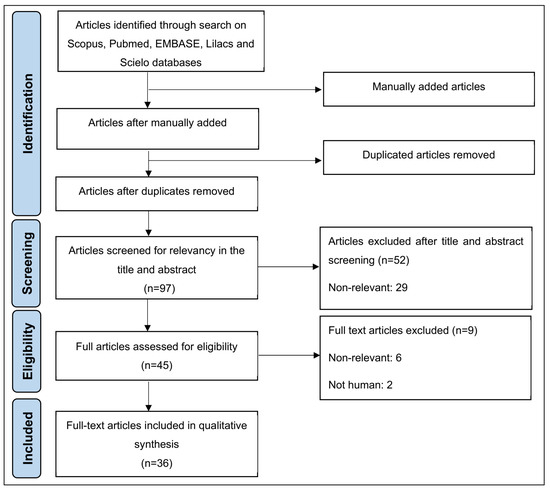 We identified 46 articles in the five selected databases using the selected search strategy and study eligibility criteria. We also manually included an additional 75 articles on the subject to increase the robustness of the present review. After removing duplicates, 97 articles were screened for relevance and compliance based on the inclusion and exclusion criteria. This analysis yielded 36 full-text articles for qualitative synthesis (Figure 1).