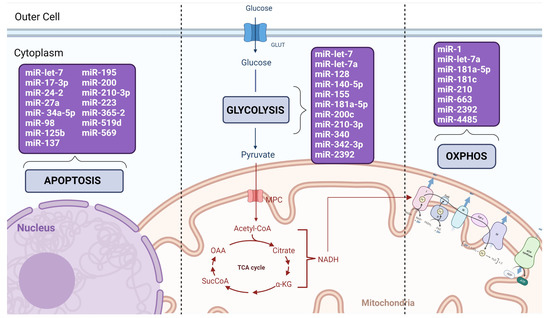 Overview of the involvement of the identified miRNAs in the apoptosis and metabolic processes of the cancer cells. Fifteen miRNAs were identified which suppress or induce apoptosis by regulating the expression of pro-and anti-apoptotic gene-targets. Eleven miRNAs were observed affecting specific steps of glycolysis, from the glucose uptake to pyruvate synthesis, by regulating several glycolytic enzymes. Finally, eight miRNAs directly affected OXPHOS by regulating gene-targets involved in mitochondria function and homeostasis.