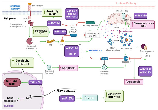 For breast cancer, two studies showed an association between miR-27a and cytotoxicity to cisplatin, doxorubicin, and/or paclitaxel [45,51]. In a study by Ueda et al. (2020), miR-27a was described as having a tumor suppressive action, considering that its overexpression increased mitochondrial ROS and rendered MCF-7 and MDA-MB-231 cells more sensitive to doxorubicin and paclitaxel by inhibiting CTH (Cystathionine gamma-lyase), xCT (Cystine/glutamate transporter), and NRF2 (Nuclear factor erythroid-derived 2-like) expression [45]. In a study conducted by Zhou et al. (2015), miR-27a presented an oncogenic function, with overexpression associated with the inhibition of the BAK (BCL2 family member) and SMAC/DIABLO/XIAP pathways, increasing resistance to cisplatin in T-47D breast cancer cells [51].