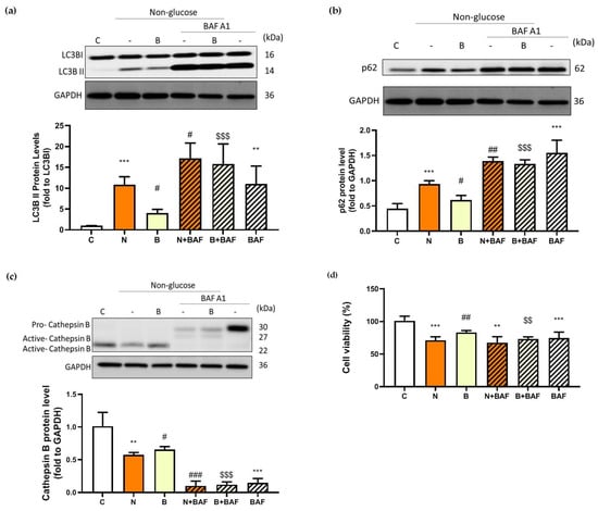 After the Neuro-2a cells were cultured in the C, N, B, BAF, N + BAF or B + BAF conditions for 24 h, the cell lysates were prepared in an ice-cold lysis buffer (50 mmol/L Tris (pH 8.0), 100 mmol/L sodium chloride (NaCl), 0.1% sodium dodecyl sulfate (SDS), 1% NP-40 and 0.5 mM ethylene diamine tetra acetic acid (EDTA) containing the protease (Roche, Basel, Switzerland). The proteins (30 μg) were boiled for 5 min, separated using 10% or 15% SDS-polyacrylamide gel electrophoresis, and then transferred onto Immobilon-P polyvinylidene fluoride membranes (0.22 µm) for 150–180 min at 280 mA and 250 V. Then, the membranes were washed three times in tris-buffered saline (TBS) plus Tween 20 (TBST) buffer for 10 min each, blocked with blocking buffer (5% BSA) for 1 h at room temperature and incubated overnight with primary antibodies, i.e., Aβ 1–42 (1:1000) (Millipore, Rehovot, Israel), PARP (1:000) (Cell signaling, Danvers, MA, USA), p62 (1:1000) (Cell signaling, Danvers, MA, USA), LC3B (1:1000) (Cell signaling, Danvers, MA, USA), cathepsin B (1:1000) (Cell signaling, Danvers, MA, USA) and glyceraldehyde-3-phosphate dehydrogenase (GAPDH) (1:10,000) (Proteintech, Rehovot, Israel) at 4 °C. The next day, the membranes were washed three times in the TBST (tris-buffered saline with Tween 20) buffer for 10 min each, incubated for 1 h in the blocking buffer with anti-rabbit/mouse immunoglobulin G (IgG) coupled to alkaline phosphatase (1:10,000), and washed three times in the TBST buffer for 10 min each. Then, the bands were detected using enhanced chemiluminescence (ECL). The chemiluminescent signals were detected by the e-BLOT Touch Imager (e-BLOT, Shanghai, China). The values shown were quantified, normalized to the internal control GAPDH, and then densitometry estimation was performed using the ImageJ software (NIH, Bethesda, MD, USA). Original, uncropped images of Western blots are presented in Supplementary Figure S1.