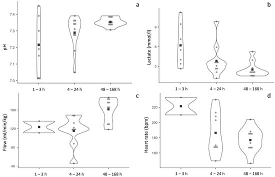 Experiments showed a trend for a progressive improvement of pH post-cannulation (p = 0.161) and a significant improvement in EC circuit flow after 30 min of connection (p = 0.003) across the study groups. Figure 2 shows data of the longitudinal evolution of these parameters in one fetal lamb of each experimental group. As shown in Figure 3, experiments with 48–168 h survival have a more homogenous distribution of pH, lactate, circuit flow and heart rate. Among the 48–168 h survival group, 4 out of 10 fetal lambs presented complications after the first day, consisting in cannulation accidents leading to interruption of flow (n = 2) and sepsis (n = 2). In three lamb fetuses in the 48–168 h group, fetal hydrops was observed at the end of the experiment.
