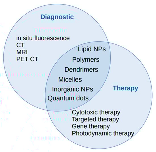 From a practical point of view some nanoparticles exhibit peculiar properties enabling potential multiple roles at once, both diagnostic and therapeutic (Figure 1). This represents an emerging concept dubbed theranostics. Such an approach is the use of quantum dots as a fluorescent agent able to guide and amplify the biological effect of bronchoscopy-delivered photodynamic therapy, an intervention particularly suited to carcinoma in situ management [,]. Similarly, near-infrared emitting QDs were experimentally successfully used to improve the intra-operatory visualization of pulmonary nodules and establish resection limits. The resulting in vivo fluorescence proved to be relatively independent of dimensions and vascularization and allowed improved detection beyond CT data [,].