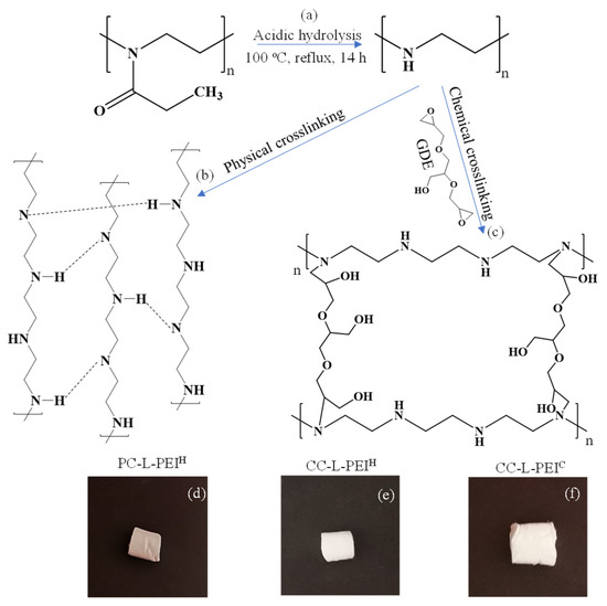 In this paper, three types of L-PEI-based materials were synthesized: physically crosslinked L-PEI hydrogels (PC-L-PEIH), chemically crosslinked L-PEI hydrogels (CC-L-PEIH), and chemically crosslinked L-PEI cryogels (CC-L-PEIC). The schematic presentation of the preparation of L-PEI-based hydrogels and cryogels is illustrated in Figure 1b,c respectively. The prepared PC-L-PEIH was physically crosslinked with NH…N hydrogen bonding, as reported in the literature [29]. On the other hand, the chemically crosslinked CC-L-PEIH and CC-L-PEIC structures were crosslinked with GDE via ring-opening reactions, as reported in the literature [8]. The amine groups of L-PEI chains reacted with the epoxy groups of GDE, and CC-L-PEIH and CC-L-PEIC structures were prepared at room temperature and −20 °C, respectively. The digital camera images of PC-L-PEIH, CC-L-PEIH, and CC-L-PEIC structures are also given in Figure 1d–f respectively. Cryogels are a special type of common hydrogel with interconnected, super porous structures, higher flexibility, elasticity, and mechanical strength, and fast response capabilities to environmental stimuli [37]. Therefore, cryogels are commonly used in tissue engineering, biomolecule separation, enzyme immobilization, etc. [38].
