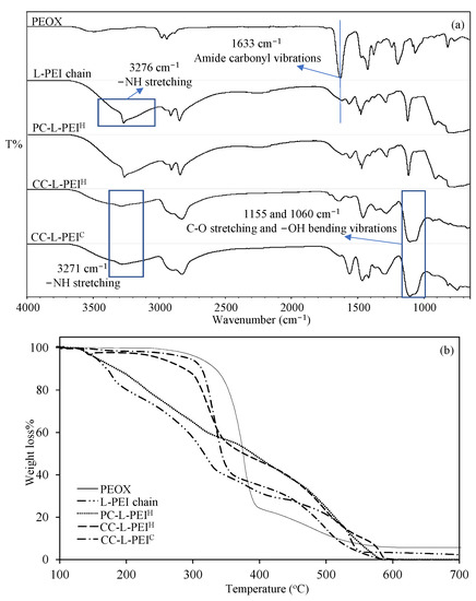 To confirm the synthesis of L-PEI from PEOX and the preparation of PC-L-PEIH, CC-L-PEIH, and CC-L-PEIC structures, FT-IR spectra are given in Figure 2a. It was clearly seen that the most distinct peak was the amide carbonyl vibration at 1633 cm−1 on the FT−IR spectrum of PEOX. Also, the disappearance of this peak after hydrolysis in acidic media and the observed peak at 3276 cm−1 which is attributed to NH stretching vibration, show the successful conversion of PEOX to L-PEI [35]. The FT−IR spectrum of PC-L-PEIH structures overlapped exactly with the FT-IR spectrum of L-PEI chains, as expected. There was also an NH stretching vibration peak at 3271 cm−1 that was clearly seen in CC-L-PEIH and CC-L-PEIC structures. There were also two new peaks observed at 1155 and 1060 cm−1 which are assigned to C−O stretch and −OH bending vibration as a result of crosslinking with GDE [8].