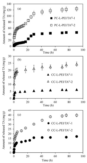 The controllable release of TA can be very important because of the well-known radical scavenging, anti-inflammatory, neuro-protective, and antiviral effects, as well as its fairly good antimicrobial properties against various microorganisms such as yeast, fungi, or bacteria [19,20,22]. Therefore, the release study of TA from the prepared L-PEI/TA-based networks at pH 7.4 PBS at 37 °C was investigated, and corresponding graphs are given in Figure 4. The TA release from PC-L-PEI/TAH-1 and PC-L-PEI/TAH-2 at pH 7.4 PBS at 37 °C is presented in Figure 4a. The linear and rapid releasing of TA from both PC-L-PEI/TAH-1 and PC-L-PEI/TAH-2 networks was observed up to 6 h with 9.5 ± 0.5 mg/g and 60.2 ± 3.8 mg/g, respectively, which were equal to 10 and 25% of the TA content of PC-L-PEI/TAH-1 and PC-L-PEI/TAH-2. Interestingly, a second linear TA release was observed from both PC-L-PEI/TAH-1 and PC-L-PEI/TAH-2 networks between 17–29 h, with 39.6 ± 3.9 mg/g (40% of TA content) and 107.9 ± 8.2 mg/g (43% of TA content), respectively. Moreover, the TA release from PC-L-PEI/TAH-1 and PC-L-PEI/TAH-2 slightly continued up to 91 h with 45.6 ± 3.0 mg/g and 123.8 ± 7.5 mg/g cumulative releases of TA, which were almost 50% of the TA content of related networks, respectively.