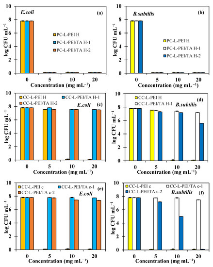 In the macro-dilution test, the growth inhibitory effects of the prepared materials at 5, 10, and 20 mg/mL concentrations were evaluated within 24 h of incubation. Hence, the observed antibacterial effects were directly related to the released amount of TA from the materials. Materials with a rapid TA release profile were expected to exhibit higher antibacterial activity. The results are illustrated in Figure 5 as the number of bacteria colonies for Gram-negative E. coli and Gram-positive B. subtilis bacteria strains. As can be seen in Figure 5a,b, PC-L-PEIH, PC-L-PEI/TAH-1, and PC-L-PEI/TAH-2 samples, even at 5 mg/mL concentration, killed >99% of both bacteria strains and were determined as MBC. As shown in Figure 5c,d, CC-L-PEIH at 5 mg/mL concentration killed 50% of both bacteria strains and was determined as the MIC value, whereas the same material at 10 mg/mL killed >99% of both strains and was determined as the MBC value. CC-L-PEI/TAH-1 at 20 mg/mL and 5 mg/mL, inhibited the growth of E. coli and B. subtilis strains, respectively, by 50% and were defined as MICs; the same material at 20 mg/mL caused toxicity on bacterial cells against B. subtilis and was calculated as the MBC. CC-L-PEI/TAH-2 at 10 and 5 mg/mL inhibited bacterial proliferation by 50% against E. coli and B. subtilis, respectively, as seen in Figure 5c. As shown in Figure 5d,e, CC-L-PEIC, even at a concentration of 5 mg/mL inhibited bacterial growth and reproduction 100% against both bacteria strains and was determined as the MBC value. Despite the fact that CC-L-PEI/TAC-1 did not show any significant antibacterial activity against E. coli up to 20 mg/mL, the same material at 20 mg/mL inhibited bacterial growth by 100% against B. subtilis as illustrated in Figure 5f. For E. coli, 280 CFU/mL formation at 10 mg/mL was detected in the medium containing CC-L-PEI/TAC-2, while 107 CFU/mL of bacteria formed in the control group of CC-L-PEI/TAC-2 at 5 and 20 mg/mL inhibited the growth of B. subtilis by 50% and 100%, respectively. The experimental results of the macro-dilution test confirm the MIC and MBC values detected on nutrient broth-containing tubes.