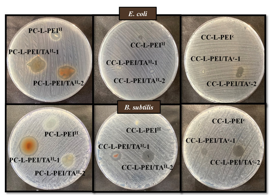 It was determined that certain materials diffused to the nutrient agar surface at a higher rate than other materials after 24 h of incubation. As shown in Figure 6, CC-L-PEI/TAC-2 compared to CC-L-PEI/TAC-1 samples and PC-L-PEI/TAH-1 compared to PC-L-PEI/TAH-2 samples provided larger zone diameters. This is consistent, considering the faster tannic acid release profiles of PC-L-PEI/TAH-1 and PC-L-PEI/TAH-2. The spread of antimicrobial materials on the agar surface resulted in a larger zone diameter. In addition, similar to the results of the macro-dilution test, the prepared materials were more effective against the Gram-positive bacteria B. subtilis than Gram-negative bacteria E. coli. It can be said that even a relatively small amount of prepared L-PEI-based materials, e.g., 1.5 mg, can create significant inhibition zones, which is quite promising.