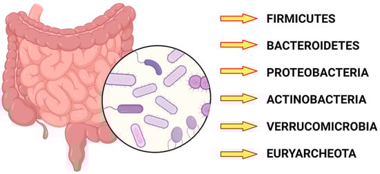 The gut microbiota is physiologically composed of Firmicutes, Bacteroides, Proteobacteria, Actinobacteria, Euryarchaeota, and Verrucomicrobia [] (Figure 1).
