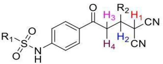 The structures of the newly synthesized Michael adducts were characterized by IR, 1H, 13C, mass spectrometric and elemental analysis. The IR spectrum clearly indicates that N-H stretching at the absorption band was observed around 3200 cm−1, while a characteristic stretching frequency was observed at 2200–2250 cm−1 due to cyano groups. Characteristic symmetric and asymmetric stretching of the -SO2NH group were also observed around 1380 and 1350 cm−1, respectively. In the 1H spectrum, a broad singlet of N-H was observed around δ 3.8. There was a doublet around δ 6.0 for the H1 proton (Figure 1). The H2 proton resonated as a doublet or multiplets around δ 4.0. The H3 and H4 protons resonated as doublets of doublets around δ 3.9 and δ 3.6, respectively. The 13C NMR spectra showed the requisite number of distinct resonances in agreement with the designated structure. The ESI-MS of the compounds showed molecular ion peaks at their respective m/e values.
