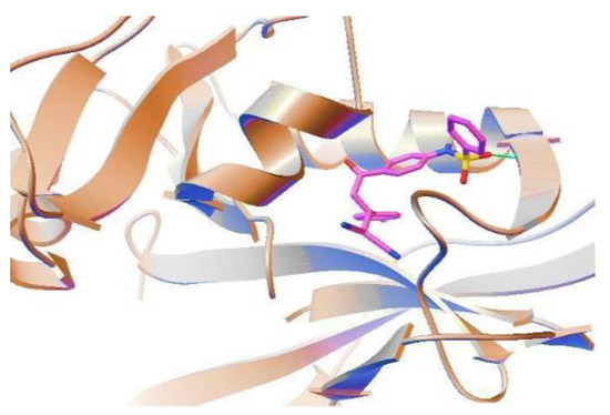 Molecular docking of 3g with Brugia malayi DHFR protein. A p-tolyl group (4-Me-C6H4) directs a sulfonyl group (O=S=O) of 3g towards Leu 29 of BmDHFR to form a hydrogen bond (green line).