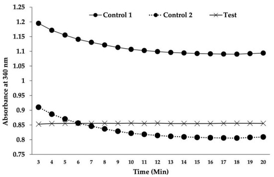 As shown in the figure, control 2 had an onset of absorbance equal to that of the test; however, it showed the expected gradual decline in absorbance over time. Therefore, it can be surmised that 3g inhibits DHFR, as reflected by the trajectory of the higher absorbance by the unutilized NADPH in the test than in control 2 (after correction for the hypochromicity of NADPH due to the possible masking effect of chalcone on the actual absorbance of NADPH). This phenomenon can be attributed to a possible hindrance in absorbance by a purine base of NADPH due to its juxtaposition with the ring structure of chalcone, similar to the hypochromicity emerging due to the base stacking effect of hybridized DNA. This experiment was conducted per the previously described method [17], in which methotrexate was used as the standard DHFR inhibitor. Notably, methotrexate is an effective inhibitor of B. malayi DHFR [25,26]. Although the present experiment lacked a positive control (methotrexate), having considered similar procedures utilized in previous studies and in our work, we are confident about the accuracy of our experimental results, and believe that they will be quite reproducible. Based on this mechanistic insight, we will include this positive control in our future studies to develop a more potent and safer anti-filarial derivative.