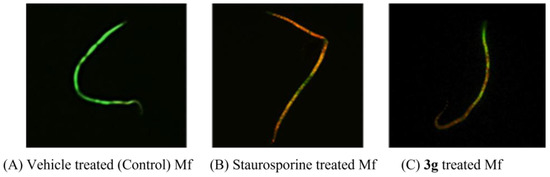 Acridine orange/ethidium bromide differential staining of Mf treated with (A) DMSO (a negative control), (B) staurosporine (20 μM, a positive control), or (C) 3g (38 μM). Staurosporine or 3g-treated Mf shows orange–yellow fluorescence, indicating apoptotic damage. In contrast, the DMSO-treated Mf was stained green, which indicates an intact cell membrane.