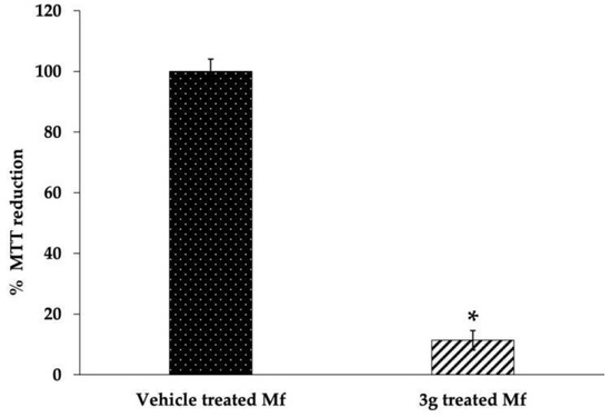 MTT reduction in 3g (38 μM) treated Mf. Results are shown as mean ± SD. * p ≤ 0.005.