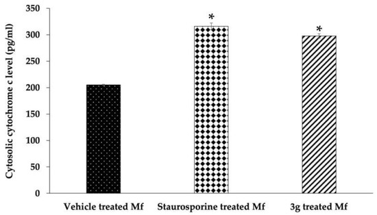 A determination of cytoplasmic cytochrome c was carried out in order to yield confirmatory evidence of apoptosis. The Mf treated with 3g or staurosporine showed markedly higher cytoplasmic cytochrome c release than that of the negative control (Figure 6). These results clearly substantiate the premise of apoptosis induction because of mitochondrial damage.