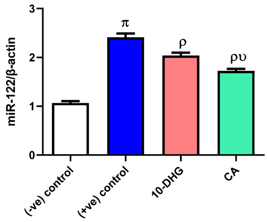 Effects of caffeic acid and 10-dehydrogengerdione treatment on miR-122 expression. (-ve) control: rats received standard rodent diet; (+ve) control: diabetic rats received CCT diet without receiving any treatment; 10-DHG: diabetic rats received CCT diet and 10-dehydrogengerdione (10 mg/kg/day); CA: diabetic rats received CCT diet and caffeic acid (50 mg/kg/day). Data are presented as mean ± (SD), n = 6 for each group; π p < 0.05 vs. (-ve) control, ρ p < 0.05 vs. (+ve) control, υ p < 0.05 vs. 10-DHG. Used test: one-way ANOVA.