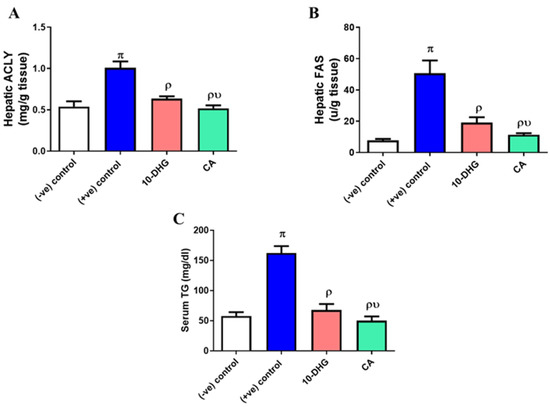 Effect of caffeic acid and 10-dehydrogengerdione treatment on hepatic (A) ACLY; (B) FAS and (C) serum triglyceride. (-ve) control: rats received standard rodent diet; (+ve) control: diabetic rats received CCT diet without receiving any treatment; 10-DHG: diabetic rats received CCT diet and 10-dehydrogengerdione (10 mg/kg/day); CA: diabetic rats received CCT diet and caffeic acid (50 mg/kg/day). ACLY: ATP citrate lyase; FAS: fatty acid synthase; TG: triglyceride; data are presented as mean ± (SD), n = 6 for each group; π p < 0.05 vs. (-ve) control; ρ p < 0.05 vs. (+ve) control, υ p < 0.05 vs. 10-DHG. Used test: one-way ANOVA.