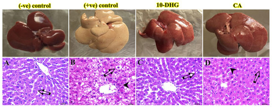 Table 2 shows the decreased body weight of the positive control rats compared with the negative control (p < 0.05). The 10-DHG and CA groups significantly gained weight compared with the positive control. Liver weight of the positive control rats demonstrated a significant increase compared with the negative control rats (p < 0.05) and turned out to be reduced by both drugs compared with the positive control rats (p < 0.05).