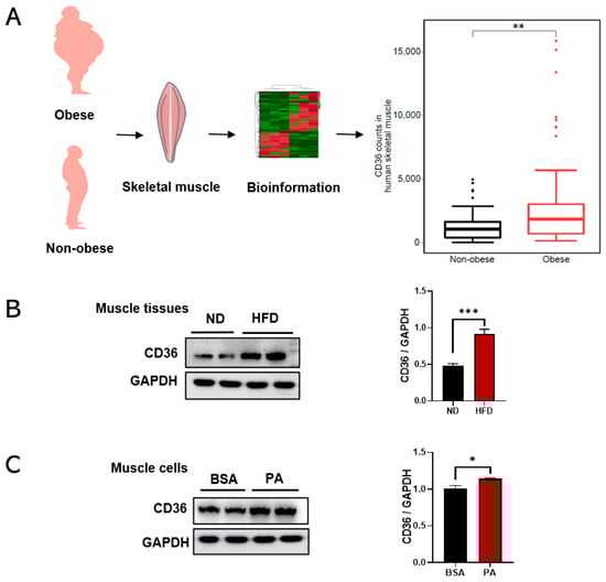 CD36 is correlated with the progression of metabolic diseases [11]. To investigate the relevance of obesity and CD36 expression, this study processed and reanalyzed publicly available transcriptome sequencing data (GEO ID: GSE81965) from the human skeletal muscle of obese and non-obese controls. Bioinformatics analysis showed that CD36 expression was upregulated in skeletal muscles from obese individuals compared with non-obese controls (Figure 1A), which were also validated in an HFD-induced animal model. The results showed that the expression level of CD36 was increased in the skeletal muscle tissue of HFD-induced mice (Figure 1B). To further test the effect of obesity and its complications on CD36 expression in the skeletal muscle cells, we established a suitable culture condition by differentiating C2C12 cells with a PA-containing medium, which mimics HFD conditions in vitro. The result also showed an increase in CD36 protein expression in PA-stimulated C2C12 myotubes (Figure 1C). Hence, it is hypothesized that CD36 may be associated with metabolic disorders in the skeletal muscle of obese humans and mice as well as in PA-stimulated C2C12 myotubes.