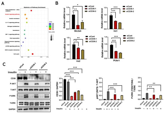 To investigate the role of CD36 in regulating the metabolic homeostasis of skeletal muscle cells, RNA-seq was performed in C2C12 myotubes with and without CD36 knockdown. Interestingly, the insulin signaling pathway was enriched by KEGG enrichment analysis (Figure 2A). Irs1, Irs2, and Pi3kr1 are key players in insulin signaling [20]. The expression levels of Slc2a4, Irs1, Irs2, and Pi3kr1 were downregulated in CD36-deficient C2C12 myotubes by qRT-PCR analysis (Figure 2B). Phosphorylation of AKT is thought to be a key step in insulin signaling in skeletal muscle [4,5]. The insulin-induced activation of AKT and ERK in CD36-deficient C2C12 myotubes was significantly lower than that of C2C12 myotubes (Figure 2C). Overall, CD36 deletion impairs insulin signaling in skeletal muscle cells in the absence of PA stimulation, suggesting its fundamental role in regulating insulin action.