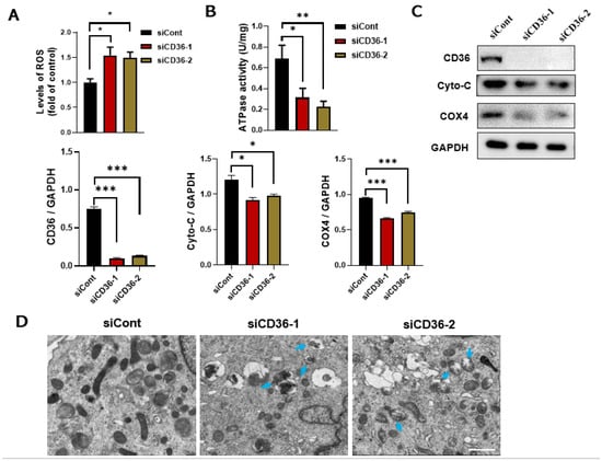 The underlying mechanism of CD36 on insulin signaling needs to be further explored. The overproduction of ROS can cause damage to the mitochondria and other cellular components, resulting in autophagy or apoptosis under high stress levels [21]. ROS content was measured to identify the function of CD36 deletion in ROS production. CD36 deletion significantly increased the ROS levels (Figure 3A), which might have impaired mitochondrial function. Mitochondrial function is expressed as changes in the protein level or the enzymatic activity of key mitochondrial components that promote oxidation, the mRNA levels of mitochondrial markers, and mitochondrial size and shape [22]. Reduced mitochondrial protein expression, a decreased oxygen consumption rate, and impaired ATP synthesis have been observed in people with obesity or IR [15,16]. ATPase is essential for mitochondrial function. Therefore, we investigated the possible role of CD36 deletion on ATPase activity. Results showed that ATPase activity was decreased in CD36-deficient C2C12 myotubes (Figure 3B). The expression levels of Cyto C and COX4 in CD36-deficient C2C12 myotubes were also significantly reduced compared to the controls (Figure 3C). A TEM was used to examine the effect of CD36 deficiency on mitochondrial ultrastructure. Significant damage was detected in the CD36-siRNA group, along with mitochondrial vacuolization, swelling, and mitochondrial crista rupture (shown by blue arrows in Figure 3D).
