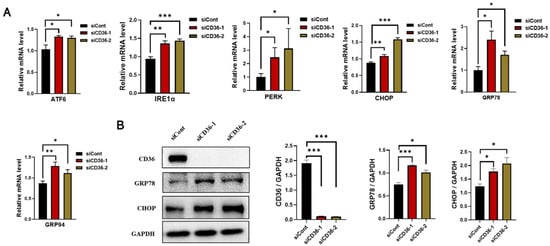 IR in skeletal muscle is linked to increased ER stress markers [23]. The expression of ER stress markers was examined to explore the role of CD36 deletion in ER stress. The results of real-time PCR revealed a significant increase in the mRNA levels of ATF6, IRE1α, PERK, CHOP, GRP78, and GRP94 after CD36 deletion in C2C12 myotubes compared to the control group (Figure 4A). The significant effect of CD36 deletion on the expression of proteins related to the ER stress pathway was confirmed by examining the expression of GRP78 and CHOP by western blot analysis. The protein expression of GRP78 and CHOP significantly increased in CD36-deficient C2C12 myotubes (Figure 4B). Therefore, CD36 expression may play a key role in ER stress, which is partly responsible for impaired insulin signaling.