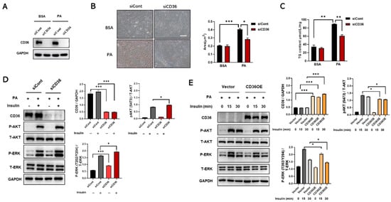 Loss of CD36 protects against insulin resistance in response to PA overload. Differentiated C2C12 myotubes transfected with siCont or siCD36 were treated with BSA or PA (200 μM) for 24 h. (A) The expression levels of CD36 were measured to assess the efficiency of knockdown. Lipid accumulations in differentiated C2C12 cells after CD36 siRNA or siCont transfection were examined by Oil Red O staining (B) and TG contents (C) under the conditions of BSA and PA stimulation. The area of lipid droplets (μm2) was calculated using the Image J system (scale bar, 10 μm). (D) Differentiated C2C12 myotubes transfected with CD36 siRNA or siCont were treated with PA (300 μM) for 15 min, and then treated with insulin (10 nM) for 30 min. Whole-cell lysates were subjected to WB analysis with antibodies against CD36, P-AKT (S473), total AKT (T-AKT), P-ERK (T202/Y204), total ERK (T-ERK), and GAPDH. (E) Vectoror CD36 overexpressing (CD36 OE) C2C12 myotubes were treated with PA (300 μM) for 15 min, and then treated with insulin (10 nM) for the indicated times. Whole-cell lysates were subjected to WB analysis with antibodies against CD36, P-AKT (S473), total AKT (T-AKT), P-ERK (T202/Y204), total ERK (T-ERK), and GAPDH. Values are presented as the mean ± SEM of three independent experiments. * p < 0.05, ** p < 0.01, *** p < 0.001 versus the control groups.