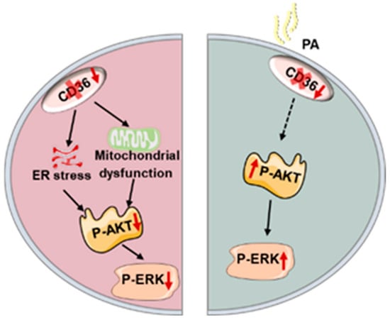 In summary, the effect of CD36 deficiency on insulin signaling is varied in C2C12 myotubes with or without PA overload. In the absence of PA load, CD36 deletion impairs insulin signaling, possibly by increasing mitochondrial dysfunction and ER stress. This suggests that CD36 is essential for the maintenance of physiological insulin action; however, CD36 deletion improves insulin signaling in the presence of PA overload due to a reduction in lipid accumulation (Figure 6). Although this work yielded a potential relationship between CD36 expression and insulin signaling in C2C12 myotubes, several limitations remain. First, additional key members of the insulin signaling pathway should be tested in the future and supplemented with physiological indicators to reflect the effects of CD36 more fully on insulin signaling activity. In addition, the dynamic impact of CD36 in the progression from IR to diabetes has not been elucidated. Finally, whether CD36 deficiency impairs insulin signaling by increasing mitochondrial dysfunction and ER stress lacks causal validation and requires further experimental proof. Uncovering these vital issues would be instrumental for designing novel CD36-targeted therapies, which would suppress or diminish IR and its harmful effects.