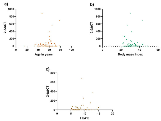 Correlation analysis between telomere length and clinical variables. Correlation between the telomere length using rt-PCR and clinical variables: (a) Telomere length and age (p = 0.9004); (b) Telomere length and body mass index (p = 0.1748); (c) Telomere length and HbA1c (p = 0.3335). All three variables were found not to be statistically significant.