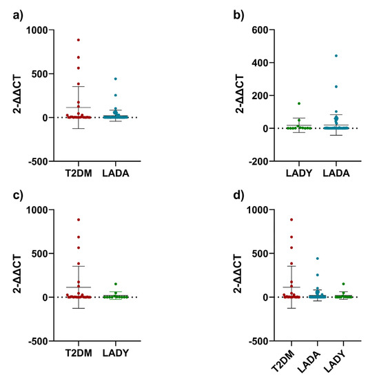 In Table 1, we show the values for Glutamic Acid Decarboxylase Antibodies (GADA), which were measured in all patients. GADA were used to determine the type of diabetes of each patient with the use of the Human Anti-Glutamic Acid Decarboxylase Antibodies ELISA Kit, following the manufacturer’s instructions. Patients with GADA > 5 IU/mL and >30 years old were diagnosed as LADA, those with GADA > 5 IU/mL and <30 years old were diagnosed as LADY, and those with GADA < 5 IU/mL as T2DM.