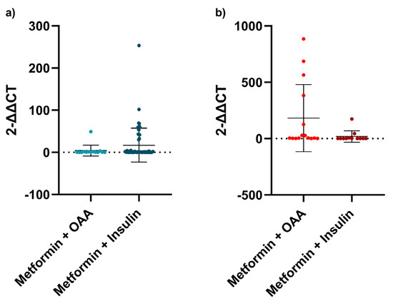Regardless of the diabetes group, there was not any difference between metformin plus any other OAA and metformin plus insulin (p = 0.1478). When dividing into subgroups, no analysis was performed in the LADY group, as all of them except for one were taking insulin. As for the LADA group, there was no difference (p = 0.3759, Figure 3a).