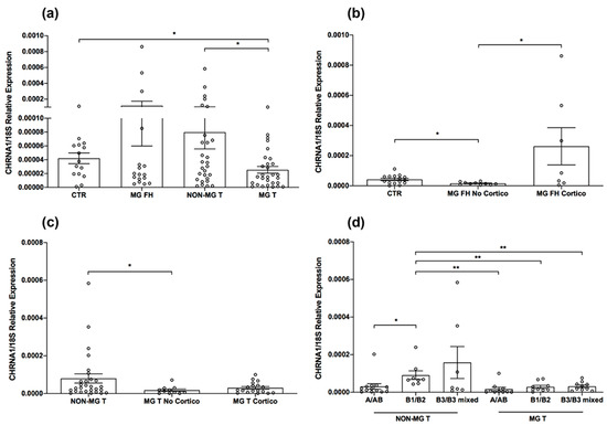 The CHRNA1 mRNA levels were unchanged in hyperplastic MG compared to the normal control thymuses when patients were not stratified according with pre-thymectomy treatment (Figure 1a), but they were significantly lower in hyperplastic thymuses from corticosteroid-naïve patients compared to the control thymuses and hyperplastic thymuses from corticosteroid-treated patients (Figure 1b). A significant reduction in CHRNA1 expression was also observed in MG thymomas, particularly in thymomas from corticosteroid-naïve patients, compared to non-MG thymomas and control thymuses (Figure 1a,c). This reduction was mainly observed in the MG type B (B1/B2 and B3/B3 mixed) subset compared to the same histological subset in the non-MG thymoma group (Figure 1d).