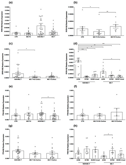 The TTN mRNA levels were also significantly lower in MG than non-MG thymomas, but not in hyperplastic MG compared to the control thymuses, with no differences observed between the corticosteroid-naïve and -treated patients (Figure 2e–g). As observed for RYR1, the type A/AB subset showed lower TTN mRNA levels in MG compared to non-MG thymomas, but the differences were not statistically significant (Figure 2h). A slight, but not significant reduction in the TTN mRNA levels was also observed in the MG B3/B3 mixed thymoma subtype compared to the same subtype in non-MG thymomas (Figure 2h).