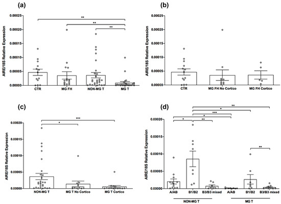 AIRE expression was assessed in hyperplastic and thymoma MG thymuses, non-MG thymomas, and normal thymuses (Table 1), using real-time PCR. We found that the AIRE mRNA levels were not altered in hyperplastic MG compared to control thymuses (Figure 3a,b), but they were significantly lower in MG thymomas, for both corticosteroid-naïve and -treated patients, compared to non-MG thymomas, control thymuses, and hyperplastic MG thymuses (Figure 3a,c).