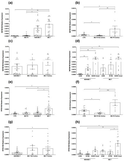 AIRE expression in MG and control thymuses. (a) AIRE mRNA levels were assessed in normal thymuses (CTR), follicular hyperplastic MG (MG FH) thymuses, thymomas from non-MG patients (NON-MG T), and MG thymomas (MG T). (b) AIRE mRNA levels in MG FH thymuses from corticosteroid-naïve (MG FH No Cortico) and -treated (MG FH Cortico) patients compared to CTR. (c) AIRE mRNA levels in MG T from corticosteroid-naïve (MG T No Ccortico) and -treated (MG T Cortico) patients compared to NON-MG T. (d) AIRE mRNA levels in NON-MG T and MG T stratified according with WHO thymoma type. In the graphs, AIRE expression levels were expressed as relative values (2−ΔCt × 100) normalized toward the endogenous 18S. Mann–Whitney test, * p < 0.05; ** p < 0.01; and *** p < 0.001.
