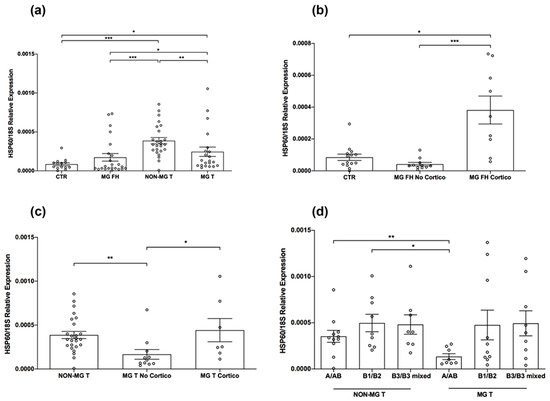 HSP60 expression in MG and control thymuses. (a–d) HSP60 mRNA levels in normal thymuses (CTR), follicular hyperplastic (MG FH) thymuses from MG patients stratified in corticosteroid-naïve (MG FH No Cortico) and -treated (MG FH Cortico), thymomas from non-MG patients (NON-MG T), thymomas (MG T) from MG patients stratified in corticosteroid-naïve (MG T No Cortico) and -treated (MG T Cortico), and NON-MG T and MG T stratified according with WHO thymoma type. In the graphs, gene expression levels were expressed as relative values (2−ΔCt × 100) normalized toward the endogenous 18S. Mann–Whitney test, * p < 0.05; ** p < 0.01; and *** p < 0.001.