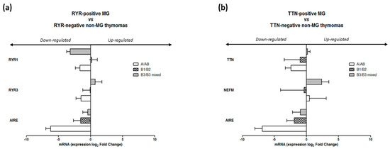 Altered expression of RYR1, RYR3, and AIRE, and of TTN, NEFM, and AIRE in thymoma from MG patients positive for anti-RYR1 (a) and -TTN (b) autoantibodies compared to thymoma from seronegative non-MG patients. Data are presented as mean ± SEM of log2-fold change ratios of 2−ΔCt × 100 expression values in MG thymomas grouped based on WHO subtypes versus the same subtypes in the non-MG thymoma group.