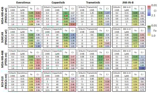 Altogether, the combination of eribulin with everolimus had the most synergistic anti-proliferation effect, especially in MDA-MB-468, MDA-MB-436, and BCX-010 cells, followed by the combinations of eribulin with trametinib or copanlisib, with JNK-IN-8 showing the least synergy. This study indicates that inhibition of mTOR/PI3K signaling by everolimus or by copanlisib may improve the anti-tumor efficacy of eribulin in TNBC. Among the tested cell lines, BCX-010 cells, followed by MDA-MB-468 cells, showed the most synergistic response to all the tested combination treatments.