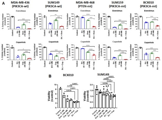 Combination of eribulin with everolimus or copanlisib is more effective than monotherapies at inhibiting TNBC cell growth. The synergistic effects of combination treatment were determined using (A) a soft agar colony formation assay at weeks 3 or 4 and (B) an ex vivo model following treatment with eribulin alone, everolimus alone, copanlisib alone, eribulin plus everolimus, or eribulin plus copanlisib. Data are presented as mean ± standard deviation. In (A), colony numbers are presented as percentage of non-treated control cells. *, p < 0.05; **, p < 0.01; ***, p < 0.001, ****, p < 0.0001 by two-tailed Student t-test. Eri., eribulin; Ever., everolimus; Cop., copanlisib; mt, mutated; wt, wild-type.