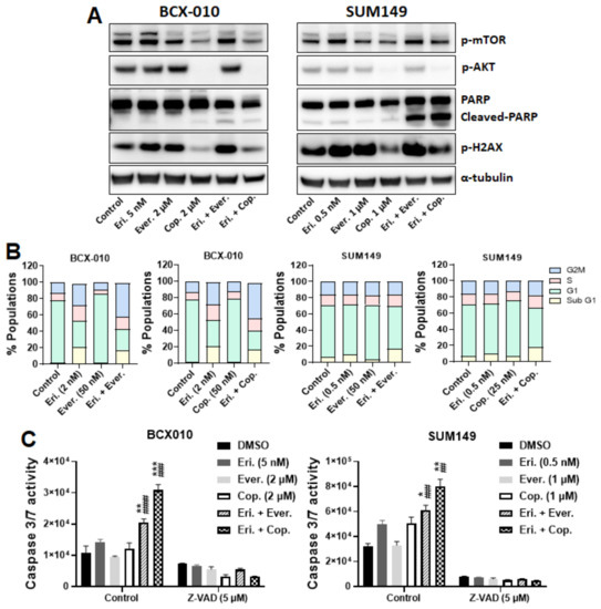 We next examined whether the synergistic anti-proliferation effect of combination treatment was a result of cell cycle arrest and further induction of apoptosis. As shown in Figure 5B, compared to eribulin alone or everolimus alone, the combination of eribulin with everolimus increased the sub-G1 population by 7.29% and 12.96%, respectively, in SUM149 cells and increased the G2M phase by 22.62% and 40.36%, respectively, in BCX010 cells. Similarly, compared to eribulin alone or copanlisib alone, the combination of eribulin with copanlisib increased the sub-G1 population by 15.08% and 20.55%, respectively, in SUM149 cells and increased the G2M phase by 11.07% and 30.44%, respectively, in BCX-010 cells. These results suggest that the synergistic anti-proliferation effects of the combination treatment of eribulin plus everolimus or copanlisib are a result of cell cycle arrest.