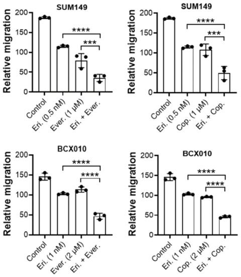 In addition to assessing the synergistic anti-proliferation effect of eribulin combined with the inhibitors of the PI3K/mTOR pathway, we examined the synergistic impact of the combination treatment on the motility of TNBC cells using a Transwell assay. As shown in Figure 6, compared to eribulin or everolimus monotherapies, the combination of eribulin with everolimus reduced migration by 54.61% (p < 0.0001) and 58.86% (p < 0.001), respectively, in SUM149 cells and by 69.02% and 55.00%, respectively (p < 0.0001 for both), in BCX-010 cells. Similarly, compared to eribulin or copanlisib monotherapies, the combination of eribulin with copanlisib reduced migration by 55.52% (p < 0.0001) and 52.11% (p < 0.001), respectively, in SUM149 cells and by 56.77% and 54.07%, respectively (p < 0.0001 for both), in BCX-010 cells. This result suggests that, in addition to synergistically inhibiting cell growth, the combination of eribulin with everolimus or copanlisib also inhibits the motility of TNBC cells, indicating the potential applications of this approach in controlling both tumor growth and metastasis.