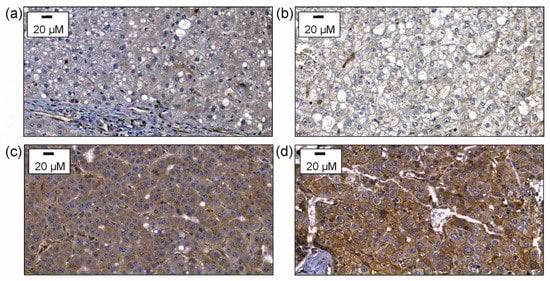 Immunohistochemical expression of chemerin. After staining with the antibody, the slides were counterstained with hematoxylin. (a) Immunohistochemical expression of chemerin in non-neoplastic liver tissue of a patient suffering from HCC. (b) Immunohistochemical expression of chemerin in HCC tissue with staining of hepatocytes scored as 1 for weak cytoplasmic staining. (c) Immunohistochemical expression of chemerin in HCC tissue with staining of hepatocytes scored as 2 for moderate staining; (d) Immunohistochemical expression of chemerin in HCC tissue with staining of hepatocytes scored as 3 for strong heterogeneous or patchy cytoplasmic and/or membranous staining.