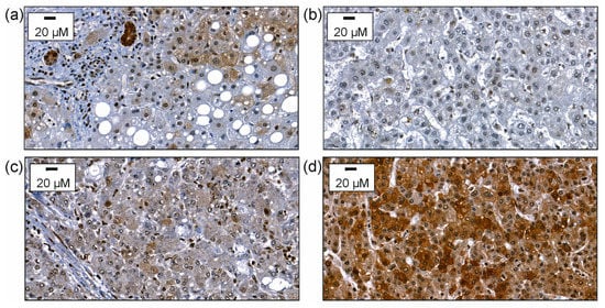 Immunohistochemical data traditionally are semi-quantified by pathologist visual scoring of the staining intensity []. Accordingly, Li et al. scored the staining intensity of chemerin in HCCs on a scale of 0–3 (0: no staining, 1: weak intensity, 2: moderate intensity, and 3: strongest intensity) [] and Lin et al. scored the chemerin staining as 0 to 3+ []. A separate study counted the staining-positive cells and measured chemerin density by Image-Pro Plus v6.2 software []. Whether nuclear staining has not been observed or was not quantified is not discussed in these manuscripts [,,]. Here, cytoplasmic and membrane staining but not nuclear staining of hepatocytes was evaluated, which is not possible with automated measurements.