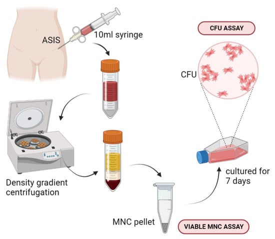 Schematic representation of bone marrow aspirate concentrate isolation and culture. ASIS: anterior superior iliac spine, MNC: mononuclear cell, CFU: colony-forming unit.