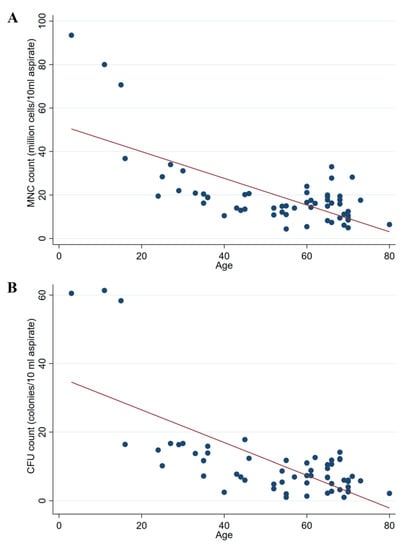 There was evidence of a statistically significant negative association between the age of the patient and the MNC count (r = −0.681, p < 0.001) and CFUs (r = −0.693, p < 0.001) (Figure 3).