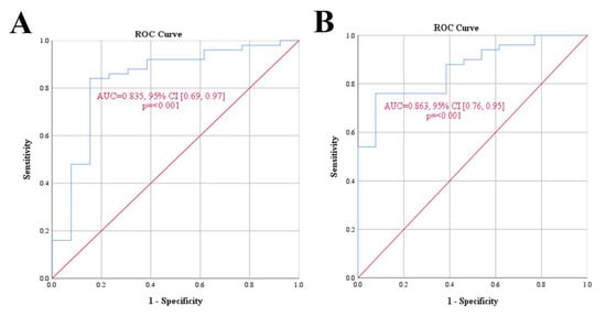 ROC curve estimation of the cut-off to analyze the relationship of the MNC count and CFU with categorical variables such as comorbidities. (A) ROC curve for MNC count and comorbid illness. (B) ROC curve for CFU count and comorbid illness.