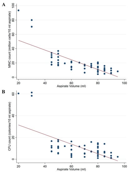 (A) Association scatter plot of aspiration volume of bone marrow and MNC count of the formed BMAC. (B) Association scatter plot of aspiration volume of bone marrow and formed CFU count.