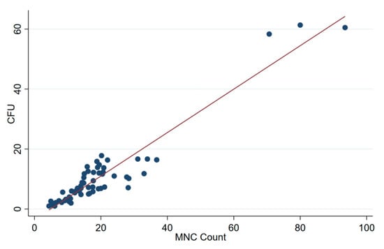 Correlation scatter plot of the MNC count of the BMAC and the CFUs formed from them.