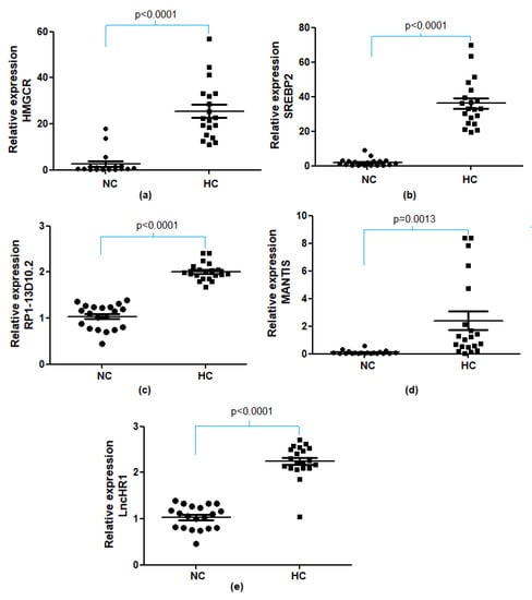 Expression of genes (a) HMGCR; (b) SREBP2 and lncRNAs (c) RP1-13D10.2; (d) MANTIS; (e) LncHR1 in normal cholesterol group and hypercholesterolemic patients. The relative levels were quantified using real-time PCR applied to total RNA extracted from leukocyte cells of normal cholesterol individuals (NC) and hypercholesterolemic patients (HC). p-value obtained by unpaired Student’s t-test. Data were normalised against the RPL27 reference gene for genes and the U6 reference gene for lncRNAs. The results were obtained from technical duplicates. Circles represent normocholesterolemic individuals, and squares represent hypercholesterolemic patients.