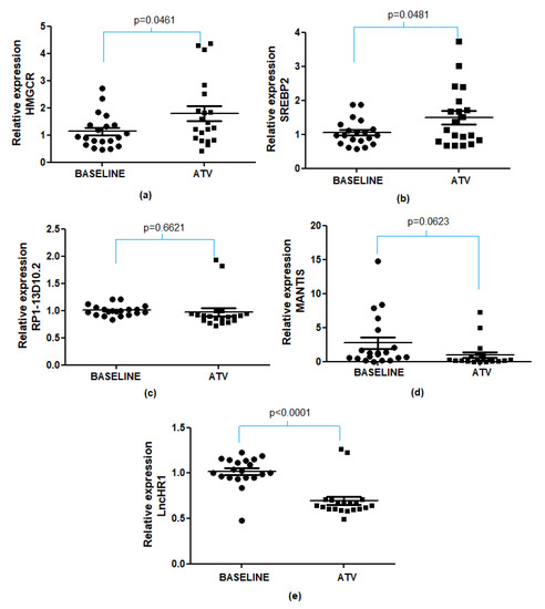 Expression of the genes (a) HMGCR; (b) SREBP2 and the lncRNAs (c) RP1-13D10.2; (d) MANTIS; (e) LncHR1 in hypercholesterolemic patients treated with atorvastatin. The levels of expression were measured by real-time PCR based on total RNA extracted from leukocyte cells of hypercholesterolemic patients before (baseline) and after treatment with atorvastatin (ATV, 20 mg/day/4 weeks). p-value obtained by paired Student’s t-test. Data were normalised against the RPL27 reference gene for genes and the U6 reference gene for lncRNAs. The results were obtained from technical duplicates. Circles represent hypercholesterolemic patients before treatment with atorvastatin (Baseline) and squares represent the same individuals after treatment with atorvastatin (ATV).