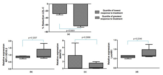 Study of the reduction caused by hypolipidemic treatment with atorvastatin showed great variability in the response (Δ reduction max − min = 45%). For this reason, the hypolipidemic response was divided into response quartiles, grouping patients with greater or lower response to the treatment; LDL-C was used as the effectiveness variable (Figure 3a). The mean reduction for the quartile with the lowest response to atorvastatin was −27.58%, while in the quartile with the greatest response the reduction was −62.69%. The difference between the mean reductions was statistically significant (p < 0.0001). In contrast, study of the levels of expression between the extreme quartiles, using LDL-C as the response variable, showed no significant differences in the lncRNAs RP1-13D10.2 (p = 0.3207), MANTIS (p = 0.5998) and lncHR1 (p = 0.2246) (Figure 3b–d).